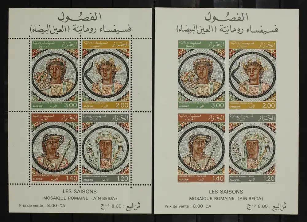 Algerije 1977, Michel 701-704 (Blok 2 A en 2 B), Romeinse mosaïken in Algerije: De vier jaargetijden, set van 2 postfrisse blokken (getand en ongetand) / MNH