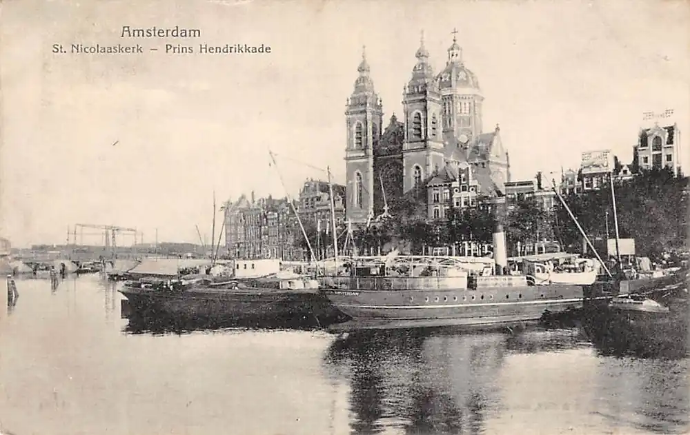 Amsterdam St. Nicolaaskerk Prins Hendrikkade met binnenvaart schepen scheepvaart HC5033 Wysoka jakość