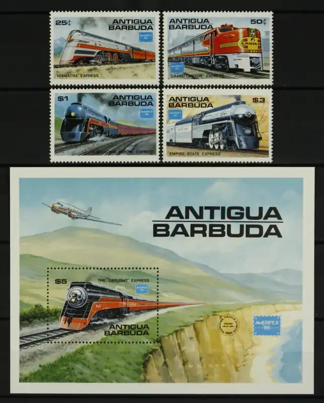 Antigua & Barbuda 1986, Michel 944-948, Int. Postzegeltentoonstelling Ameripex ’86: Amerikaanse treinen, complete postfrisse serie incl. blok 110 / MNH