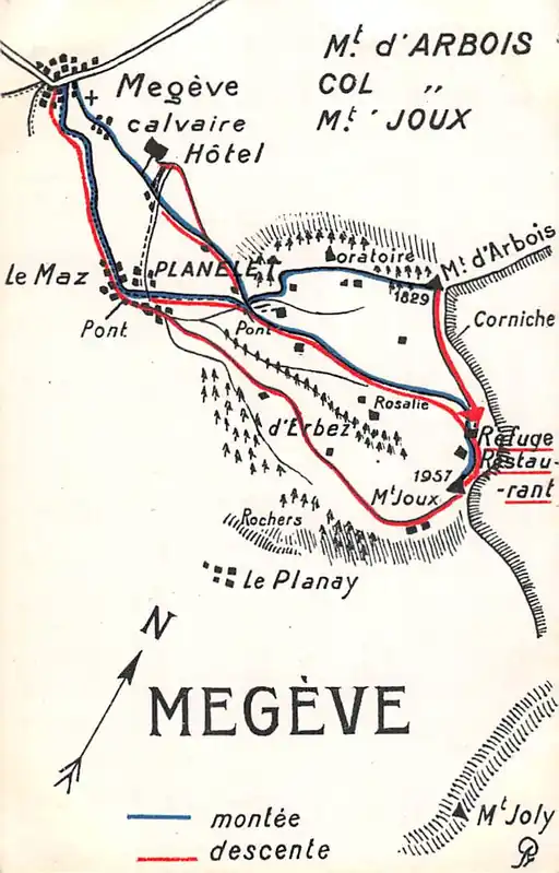 Mooie kaart met wandelroute Mt. d’Arbois – Col d’Arbois – Mt. Joux. Op ansichtkaart formaat en met reclame van bedrijven uit de regio.