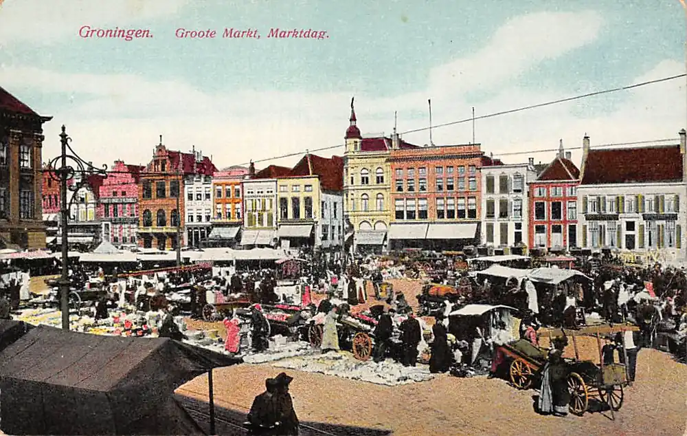 Autentyczny Groningen Groote Markt Marktdag met kramen en volk HC8730