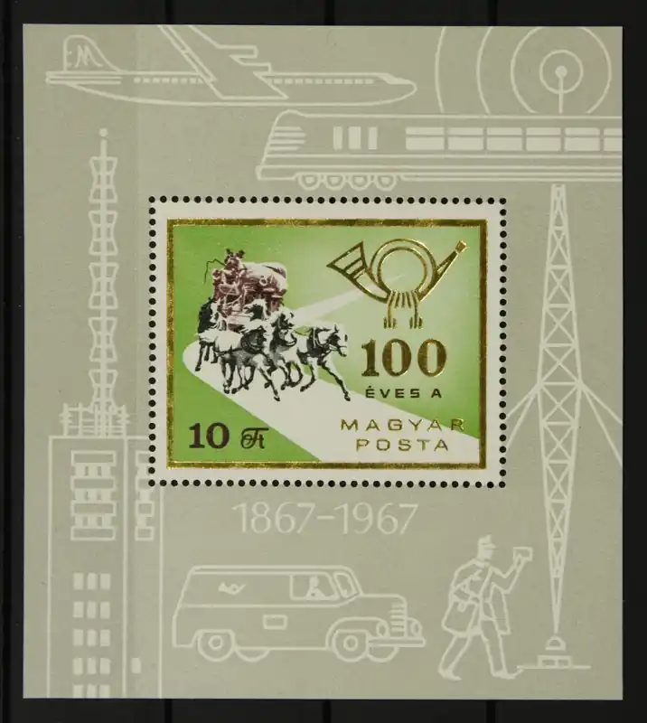Hongarije 1967, Michel Blok 60 I A, 100 Jaar Hongaarse Post, Plaatfout: streep aan voet postbode, getand blok postfris/MNH
