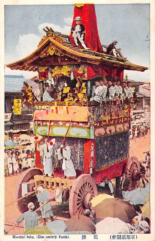 Kyoto wordt beschouwd als de culturele hoofdstad van Japan. Het staat bekend om zijn traditionele festivals die al meer dan duizend jaar worden gehouden. Gion is de geishawijk van Kyoto. De Gion Matsuri staat bekend als een van de drie grote festivals van Japan met als hoogtepunt een massale parade op 17 juli. De Grote Hokowagens hebben een gewicht van 12 ton, de kleinere wagens wegen 1200- 1600 kg. Ongeveer 12 tot 40 mensen trekken en duwen de wagens tijdens de processie.\\r\\n\\r\\nMooie ongelopen ansichtkaart [1930]