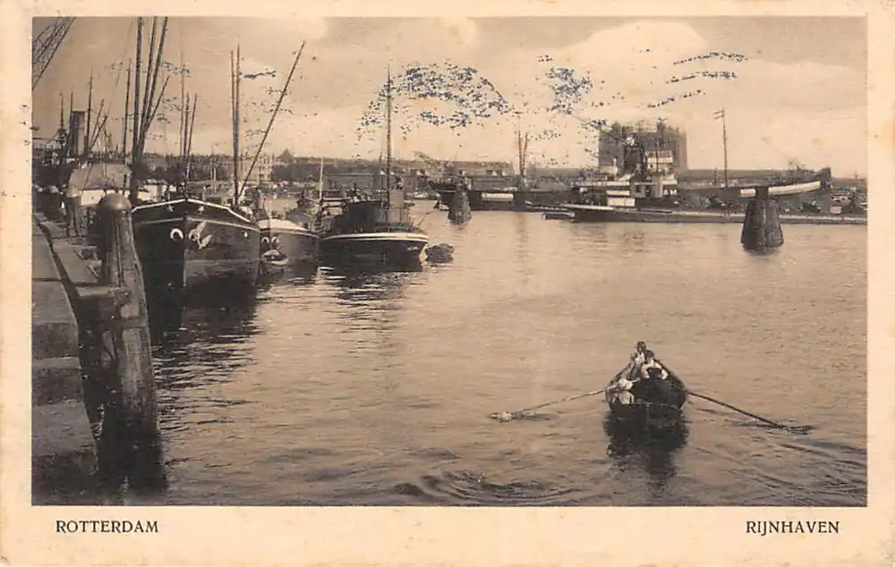 Bezpieczna płatność Rotterdam Rijnhaven met binnenvaart schepen en roeiboot Scheepvaart 1915 HC14173