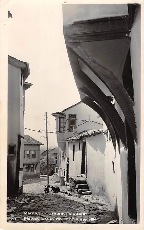 Gelopen ansichtkaart met stempels Gara Plovdiv. Punaisegaatjes boven en hoekjes iets gesleten.