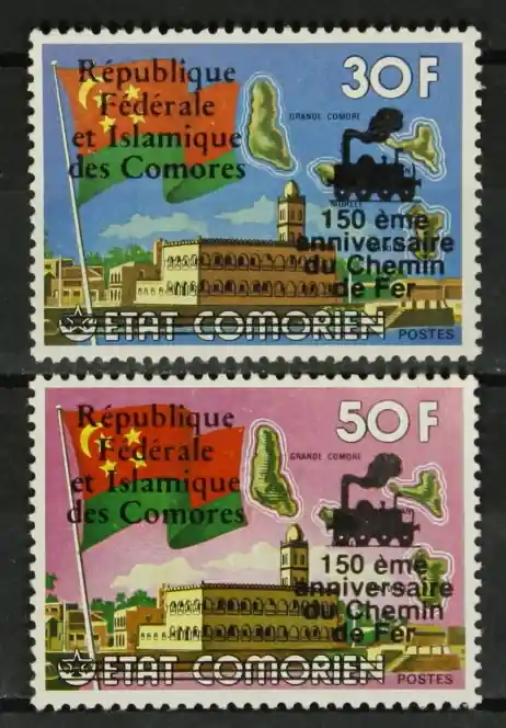 Comoren 1978, Michel 450-451, 150 Jaar Spoorwegverbinding Liverpool-Manchester (Michel 436 en 438 met opdruk), complete postfrisse set / MNH