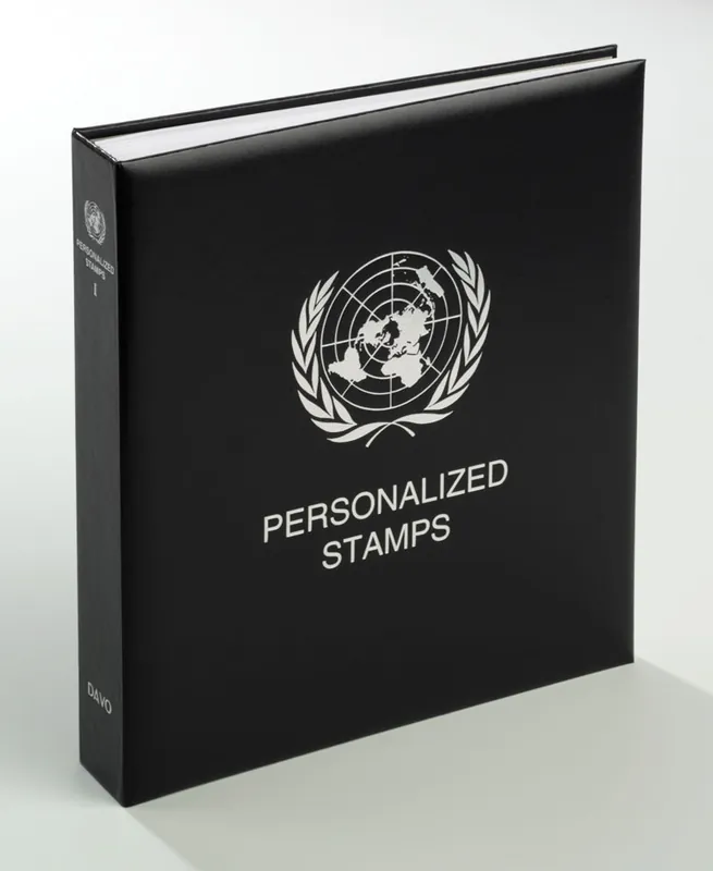 Davo Luxe album Verenigde Naties – Persoonlijke Postzegels deel I (tijdvak 2003-2018)Luxe uitvoering (170 grs. stevig papier) met heldere klemstroken in donkerblauwe gewatteerde band, compleet met cassette.