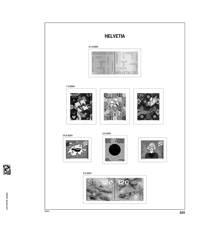 Davo Luxe supplement Zwitserland 2024Bevat 8 luxe bladen (170 grs. stevig papier), met heldere klemstroken. Bladnrs. 224 t/m 229 en B58, B59.