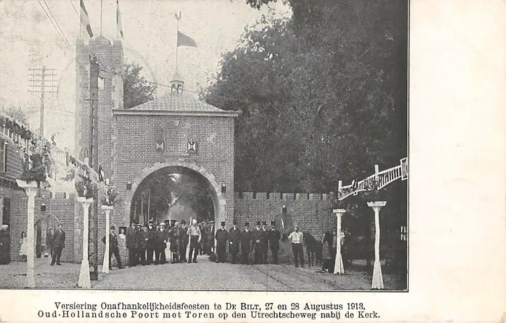De Bilt Versiering Onafhankelijksheidsfeesten te De Bilt, 27 en 28 Agustus 1913 Oud-Hollandsche Poort met Toren op de Utrechtscheweg nabij de Kerk HC19736 Ekspresowa dostawa