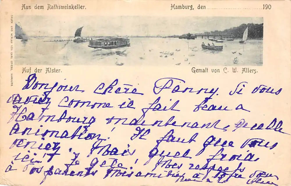 Carl Griese Hamburg. Gelopen ansichtkaart met postzegel en stempel Grossflottbek 1908.