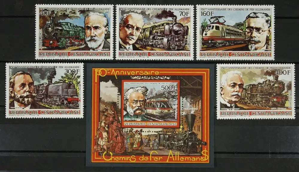 Centraal Afrika 1986, Michel 1259-64, 150 Jaar Spoorwegen in Duitsland, complete postfrisse serie incl. blok / MNH