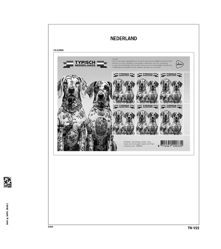 Davo Luxe supplement Typisch Nederlands 2024 (zwart-wit uitvoering)Dit supplement bevat 5 bladen van stevig (170 grs.) papier, voorzien van heldere klemstroken voor het onderbrengen van de 5 bijzondere velletjes “Typisch Nederlands” die in 2024 zijn uitgegeven.Het bevat de bladnrs. TN V21 t/m TN V25.