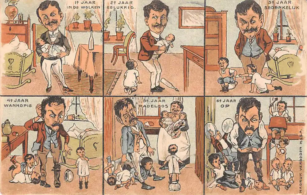 Fantasie Vintage Cartoon Vader met opgroeiende kinderen Spotprent 1904 HC22513 Wyprzedaż