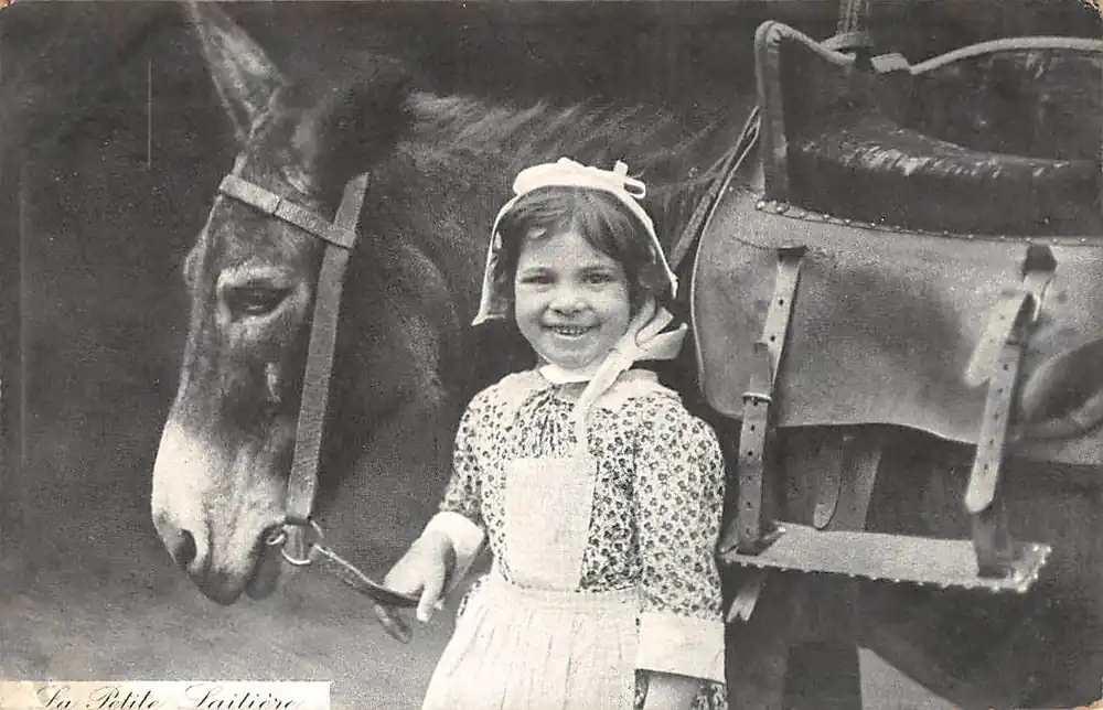 Fantasie Vintage La Petite Laitiere Melkmeisje met ezel Kind Dieren 1906 HC8470 Zwrot pieniędzy