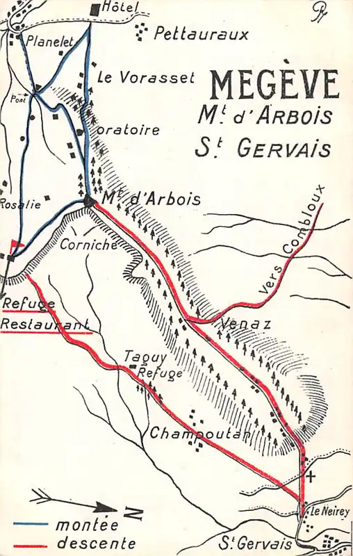 Aparte kaart op ansichtkaartformaat met op de voorkant de wandelroute naar Mt. d’Arbois – St. Gervais.