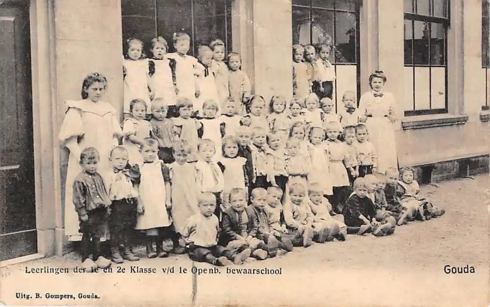 Uitg. B. Gompers. Zeldzame ansichtkaart van de school op de binnenplaats waar later het stadsarchief gevestigd was.Heel lichte gebruikerssporen.