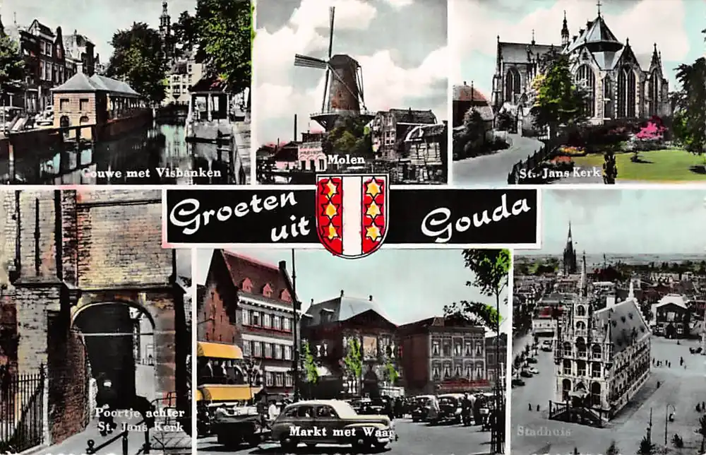 Gouda Groeten uit 1961 Gouwe Molen Vest Poortje St. Jan Markt met Waag Stadhuis HC14722 Szybka dostawa