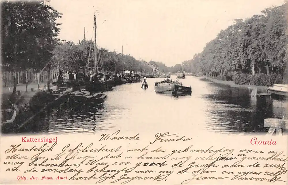 Gouda Kattensingel en Regentesseplantsoen met baggermolen en binnenvaart schepen Scheepvaart 1902 HC7093 Oryginalny
