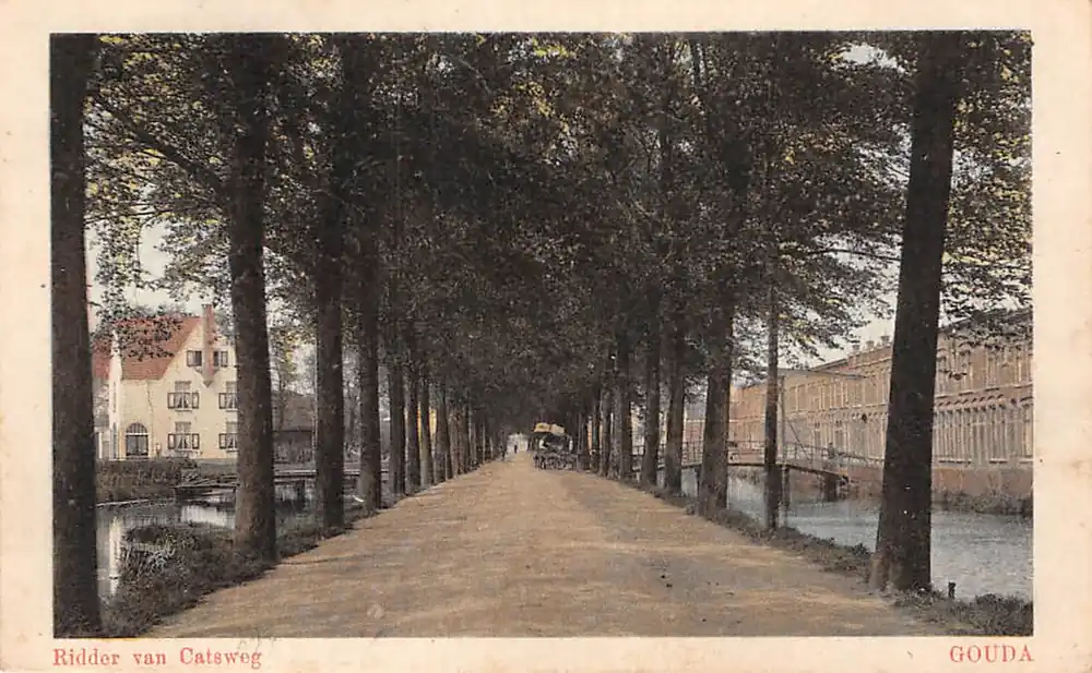 E. & B. Gelopen ansichtkaart met postzegel en stempel Gouda 1921. Hoekjes miniem gesleten.