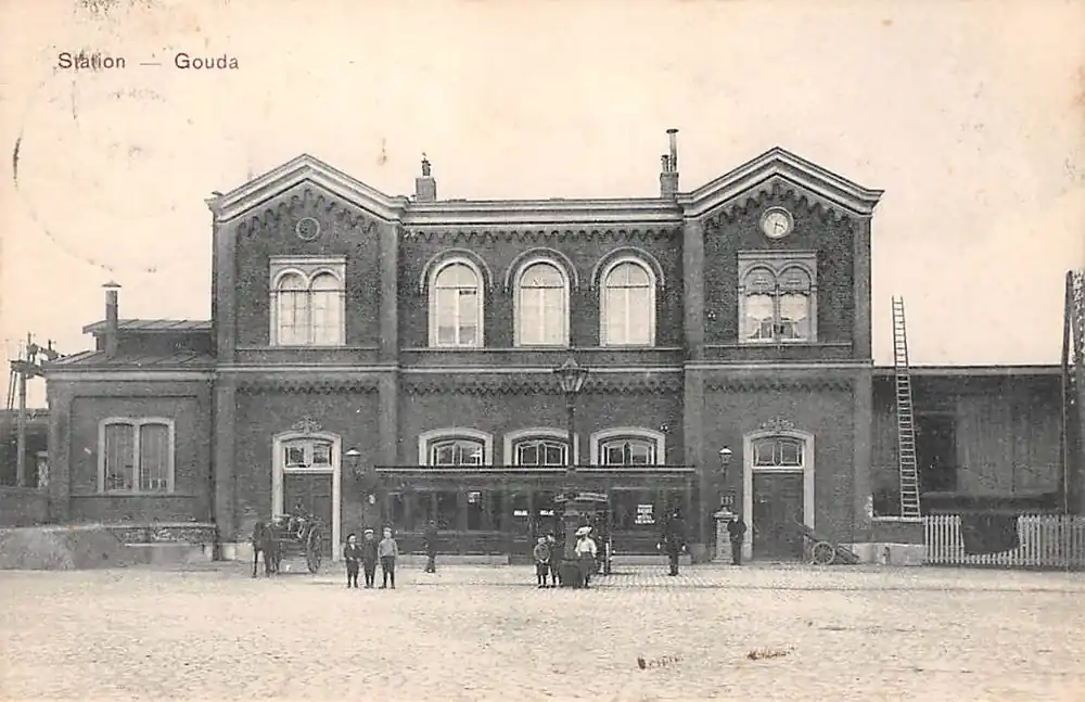 Uitg. Warenhuis, Markt 54, Gouda. Gelopen ansichtkaart met postzegel en stempels 1910.