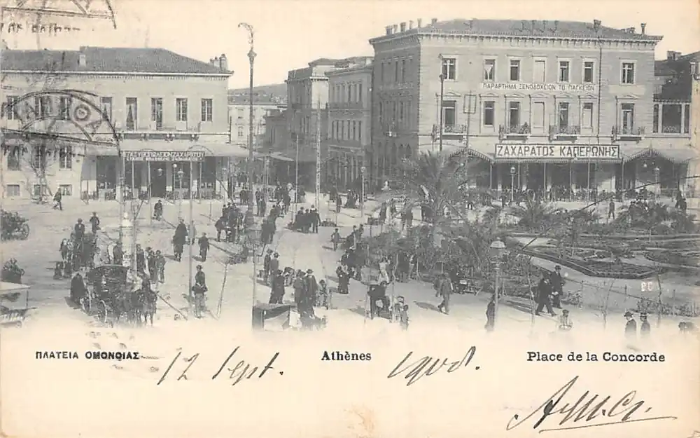 152 Pallas & Cotzias, Athenes. Mooie gelopen ansichtkaart met postzegel en stempels 1908.