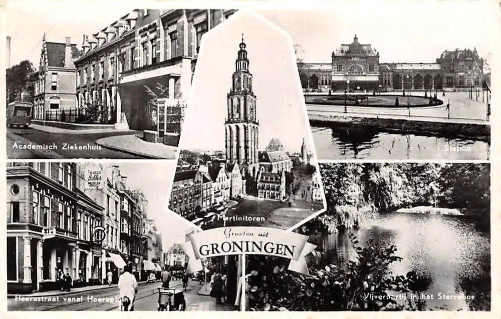 Groningen Groeten uit 1956 Academisch Ziekenhuis Heerestraat Sterrebos Station en Martinitoren Szybka dostawa