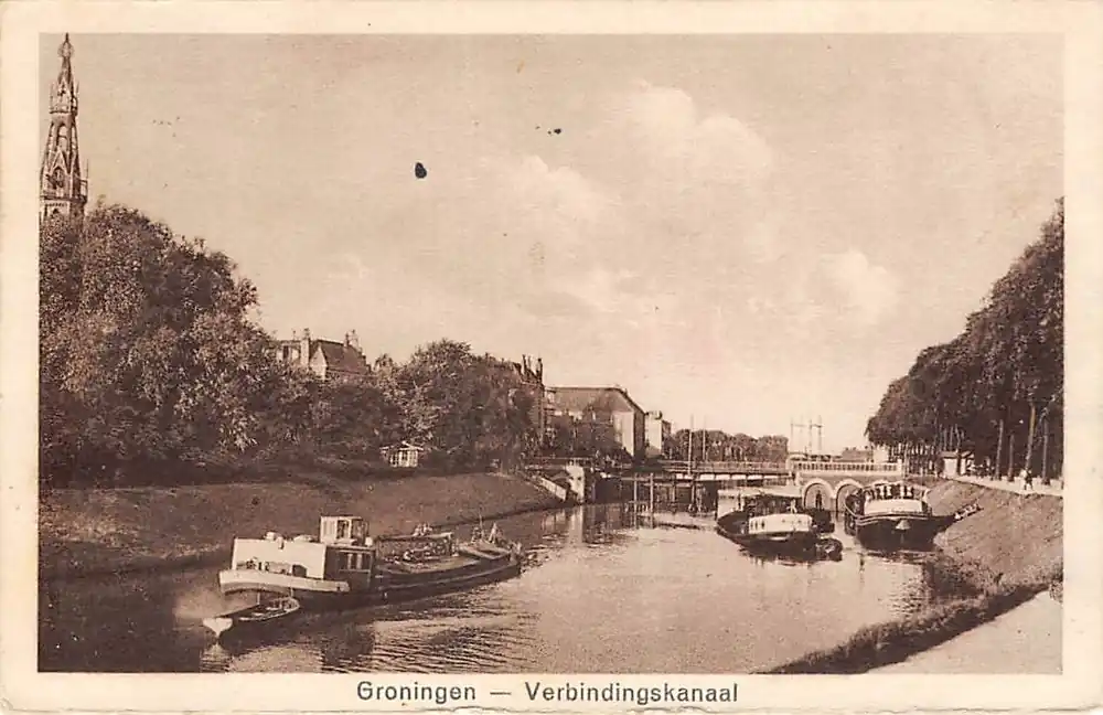 Uitgave Firma Ozinga, Groningen. Gelopen ansichtkaart met stempel Groningen 1930. Achterzijde geschaafd. Aan boven- en onderrandje te zien is de kaart afkomstig uit een aaneengeschakelde set kaarten.