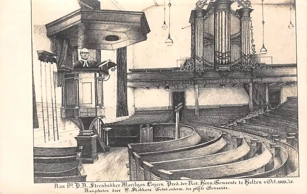 Originele fotokaart; zonder uitgever. De oorspronkelijke tekening werd aangeboden door R. Sokkers Godsdienstonderwijzer der zelfde Gemeente. Niet gelopen ansichtkaart.