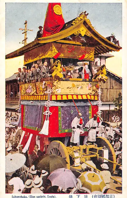 Kyoto wordt beschouwd als de culturele hoofdstad van Japan. Het staat bekend om zijn traditionele festivals die al meer dan duizend jaar worden gehouden. Gion is de geishawijk van Kyoto. De Gion Matsuri staat bekend als een van de drie grote festivals van Japan met als hoogtepunt een massale parade op 17 juli. De Grote Hokowagens hebben een gewicht van 12 ton, de kleinere wagens wegen 1200- 1600 kg. Ongeveer 12 tot 40 mensen trekken en duwen de wagens tijdens de processie.\\r\\n\\r\\nMooie ongelopen ansichtkaart [1930]
