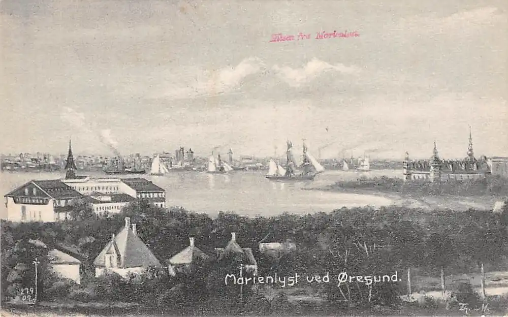 281 J.M. Helsinger Enerat. Ongelopen ansichtkaart. Rood stempeltje: Hilsen fra Marienlyst.