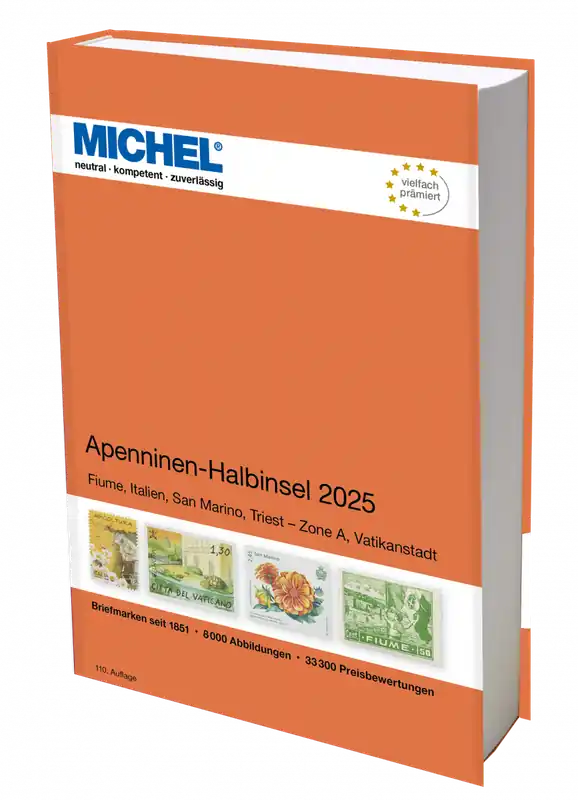 Michel Europa catalogus deel 5: Apenninen-Halbinsel 2025 (E5)Dit is het 5e deel van de Michel Europa reeks.110e editie, uitgave 2 mei 2025. Hardcover met 720 bladzijden, meer dan 7.500 afbeeldingen in kleur en ca. 31.600 prijsnoteringenInhoud: Fiume, Italië, San Marino, Triest-Zone A, Vaticaan.