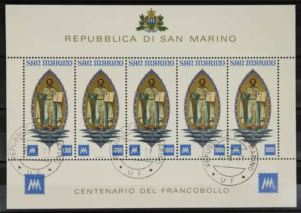 San Marino 1977, Michel 1147 (Kleinbogen), 100 Jaar Postzegels in San Marino, gestempeld / used