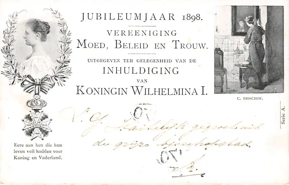 Najlepsza cena Amsterdam Jubileumjaar 1898 Vereeniging Moed, Beleid en Trouw Militair Inhuldiging Koningin Wilhelmina Kleinrondstempel Utrecht-Station Filatelie HC5800