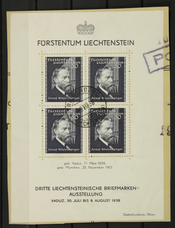Liechtenstein 1938, Michel 170, Blok 3, 3e Liechtensteinse Postzegeltentoonstelling, gestempeld op briefstuk