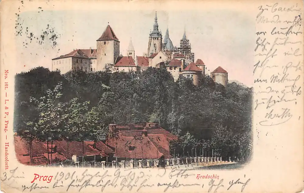 Nro. 101. L. & P. Prag. Handcolorit. Gelopen handgekleurde ansichtkaart met stempels 1901. Postzegel netjes verwijderd. Hoekjes iets gebruikt; zie de scans.