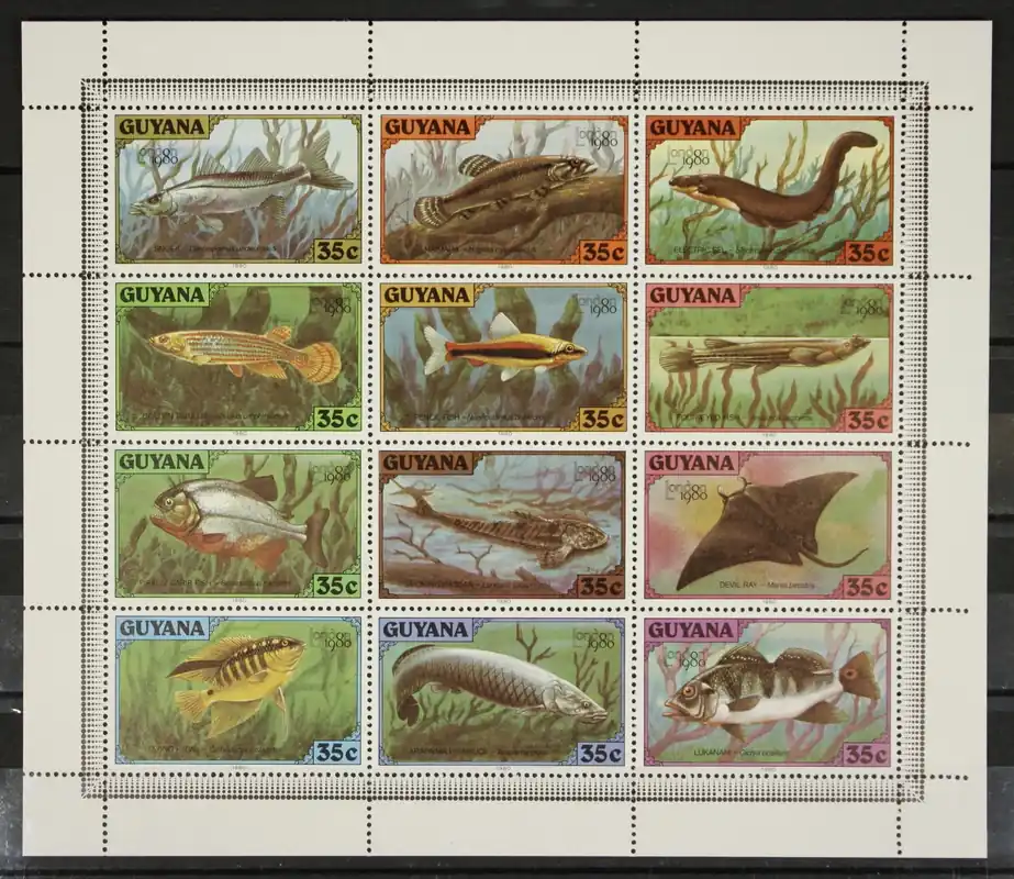 Guyana 1980, Michel 580-591, Int. Postzegeltentoonstelling London ’80: Vissen, complete postfrisse serie in Kleinbogen / MNH