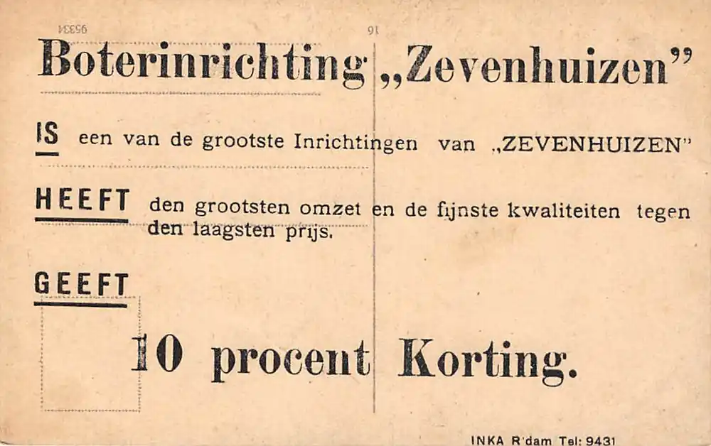 Duitse ansichtkaart met op de achterkant Rotterdamse reclame van Boterinrichting Zevenhuizen. Druk Inka Rotterdam.