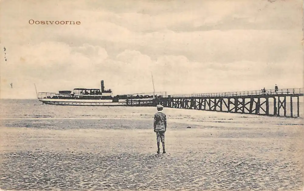 Oostvoorne aan Zee Jongen op het strand kijkt naar de stoomboot aan de aanlegsteiger Schepen Scheepvaart 1921 HC61534 Zamów teraz