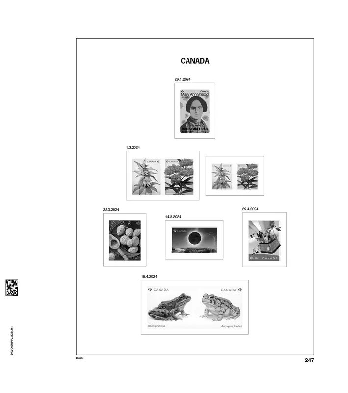 Davo Luxe supplement Canada 2024Bevat 8 Luxe bladen (170 grs. stevig papier) met heldere klemstroken. Bladnrs. 247 t/m 251 en B189 t/m B191.