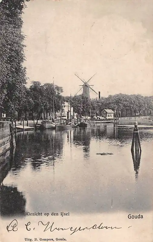 Oryginalny Gouda Gezicht op den IJssel Molen en binnenvaart schepen Gompers HC3938