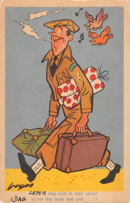 Oryginalny Militair Humor Zaterdag kom ik met verlof is me dat even een bof..!! Illustrator Voges 1947 HC25544