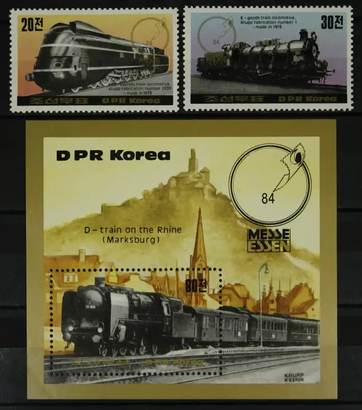 Noord-Korea 1984, Michel 2465-2467, Int. Postzegeltentoonstelling Essen: Treinen, complete postfrisse serie incl. Blok 177 / MNH