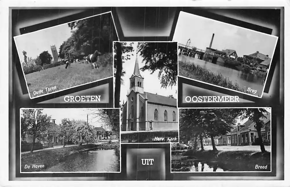 Uitgave G.J. Kuipers Oostermeer. Witte bovenrandje minieme bruine vlekjes. Met postzegel en stempel Bergum 1957.