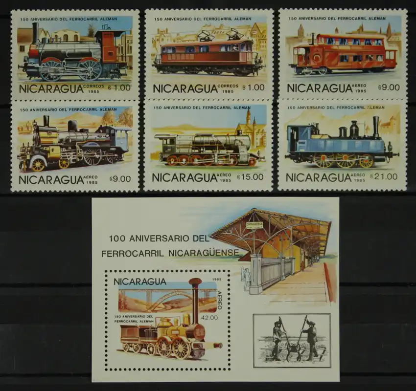 Nicaragua Michel 2579-2585, 100 Jaar Nic. spoorwegen / 150 Jaar Duitse spoorwegen, complete postfrisse serie incl. blok / MNH