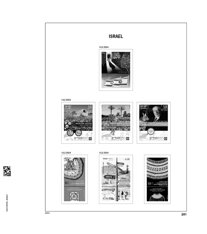 Davo Luxe supplement Israel 2024Bevat 5 Luxe bladen (170 grs. stevig papier) met heldere klemstroken. Bladnrs.: 281 t/m 284 en blad B79.