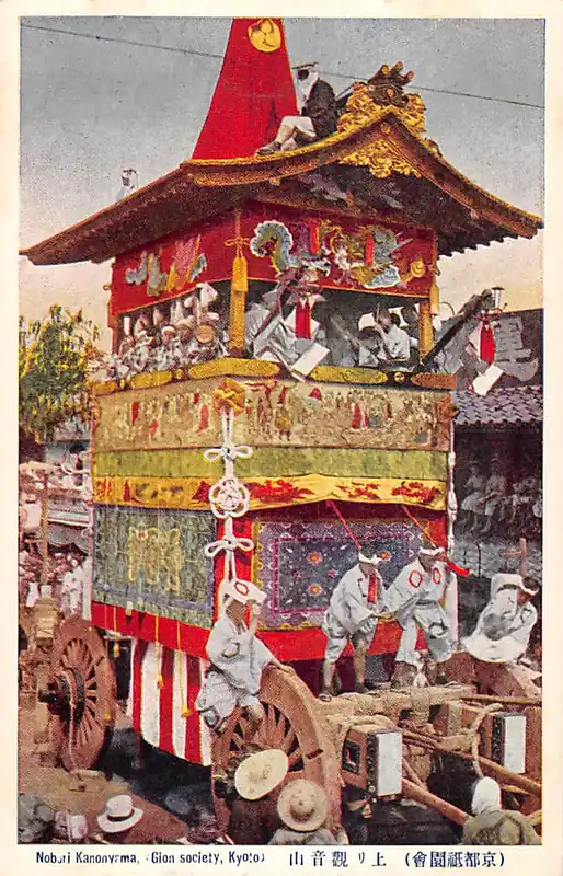 Kyoto wordt beschouwd als de culturele hoofdstad van Japan. Het staat bekend om zijn traditionele festivals die al meer dan duizend jaar worden gehouden. Gion is de geishawijk van Kyoto. De Gion Matsuri staat bekend als een van de drie grote festivals van Japan met als hoogtepunt een massale parade op 17 juli. De Grote Hokowagens hebben een gewciht van 12 ton, de kleinere wagens wegen 1200- 1600 kg. Ongeveer 12 tot 40 mensen trekken en duwen de wagens tijdens de processie.\\r\\n\\r\\nMooie ongelopen ansichtkaart [1930]