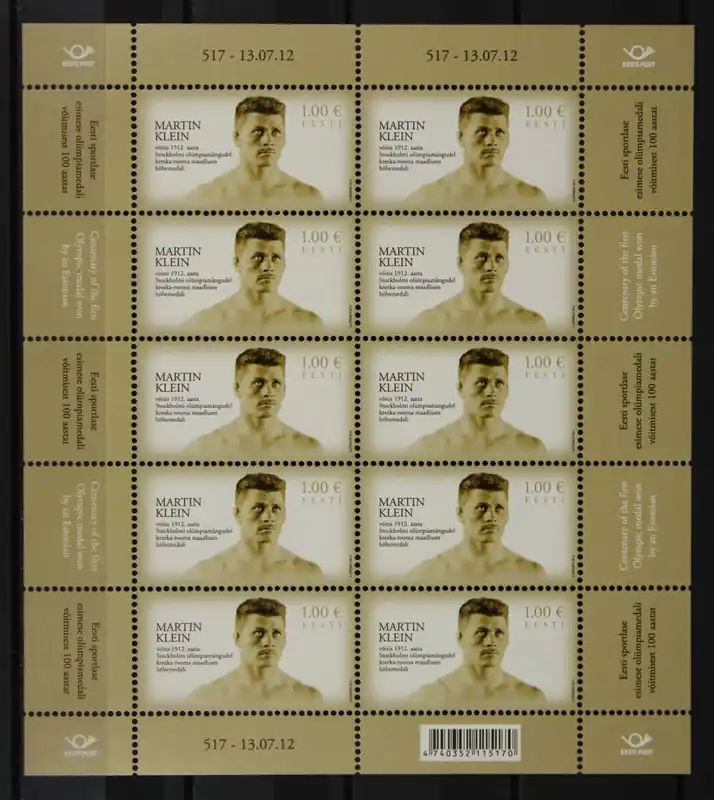 Estland 2012, Michel 737 in Kleinbogen, 100e Verjaardag van een Estlandse Medaillewinnaar bij de Olympische Spelen, postfris / MNH