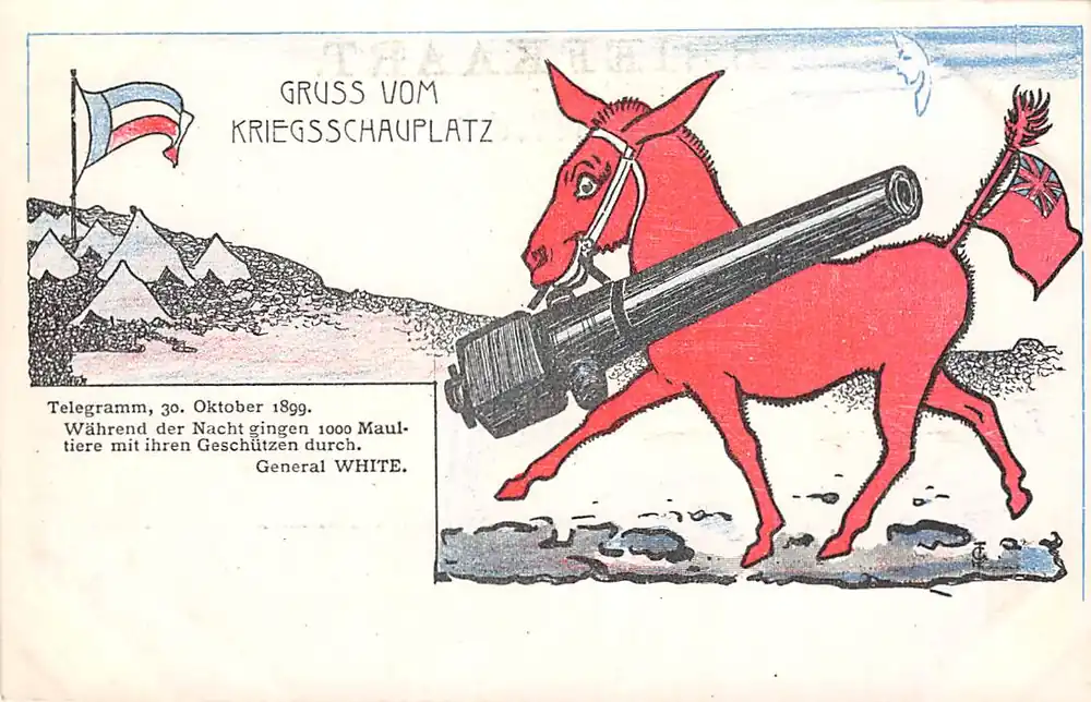 Premium Zuid-Afrika Boerenoorlog Der Boerenkrieg Boer War Gruss vom Kriegsschauplatz 30 Oktober 1899 Wahrend der Nacht gingen 1000 Maultiere mit ihren Geschutzen durch. General White Militair Oorlog Caricature Karikatur South Africa Duitsland Deutschland Engeland England Europa Afrika HC40986