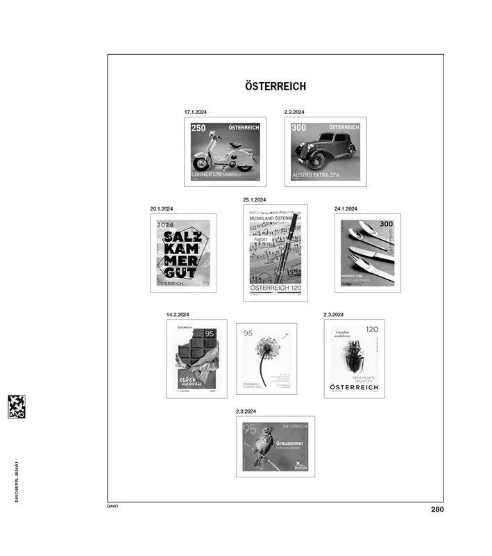 Davo Luxe supplement Oostenrijk 2024Bevat 9 luxe bladen (170 grs. stevig papier), met heldere klemstroken. Bladnrs. 280 t/m 284 en B83 t/m B86.