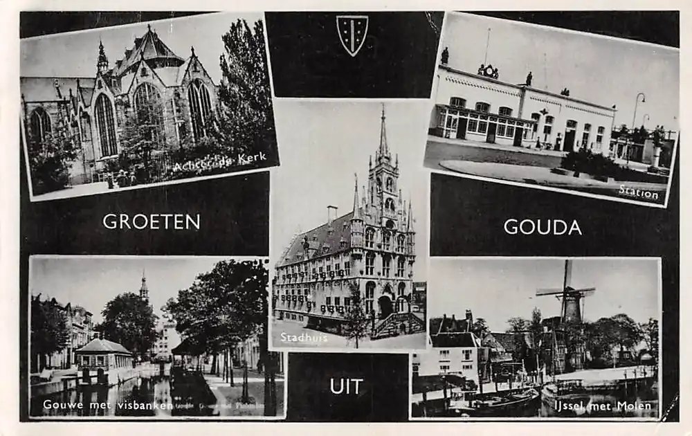 Rabat Gouda Groeten uit 1959 Achter de Kerk Station Stadhuis Gouw en IJssel met molen HC14708